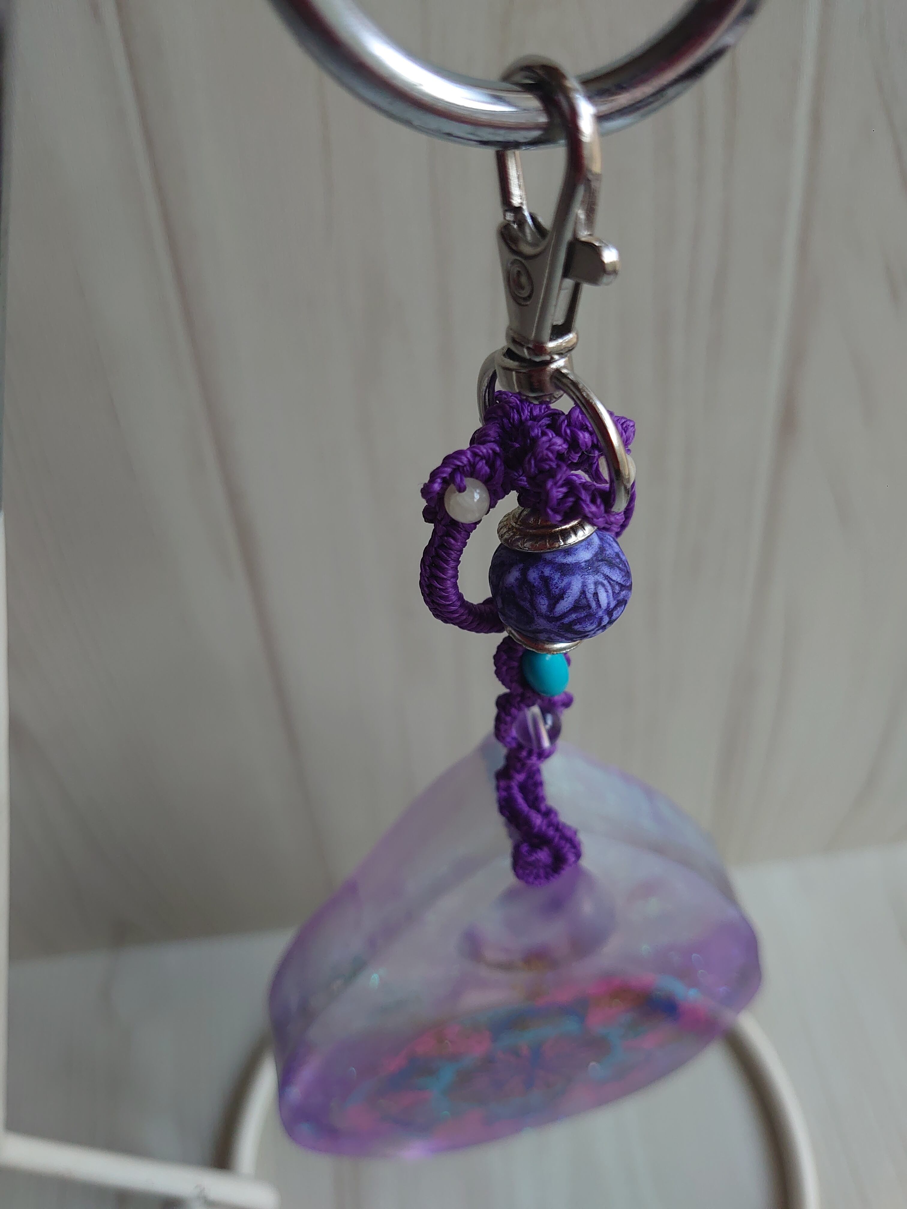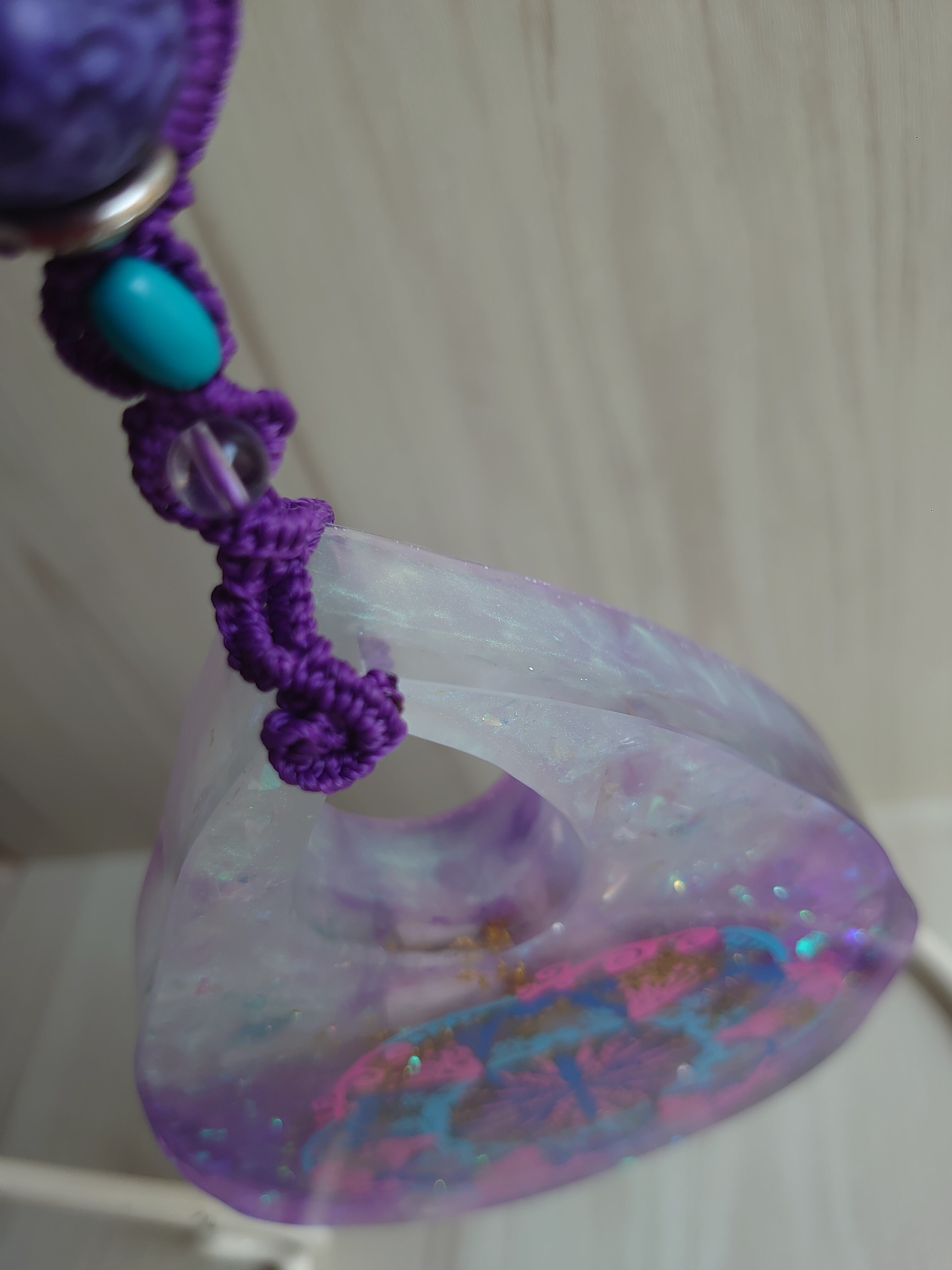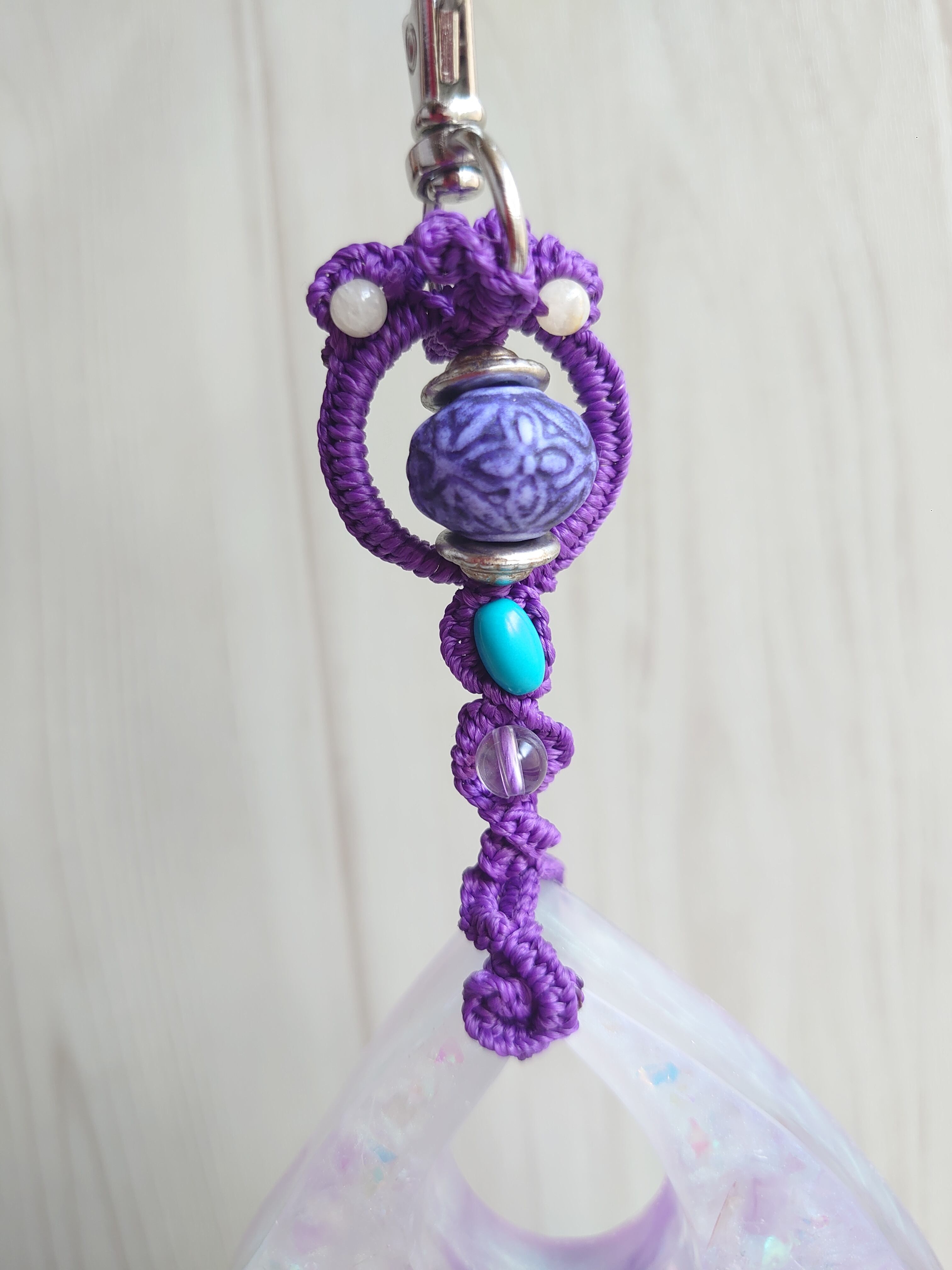 鮮やかな紫色が特徴で、クンツァイトと曼荼羅アートが施されており、マクラメ編みで吊るせるデザインが魅力です。